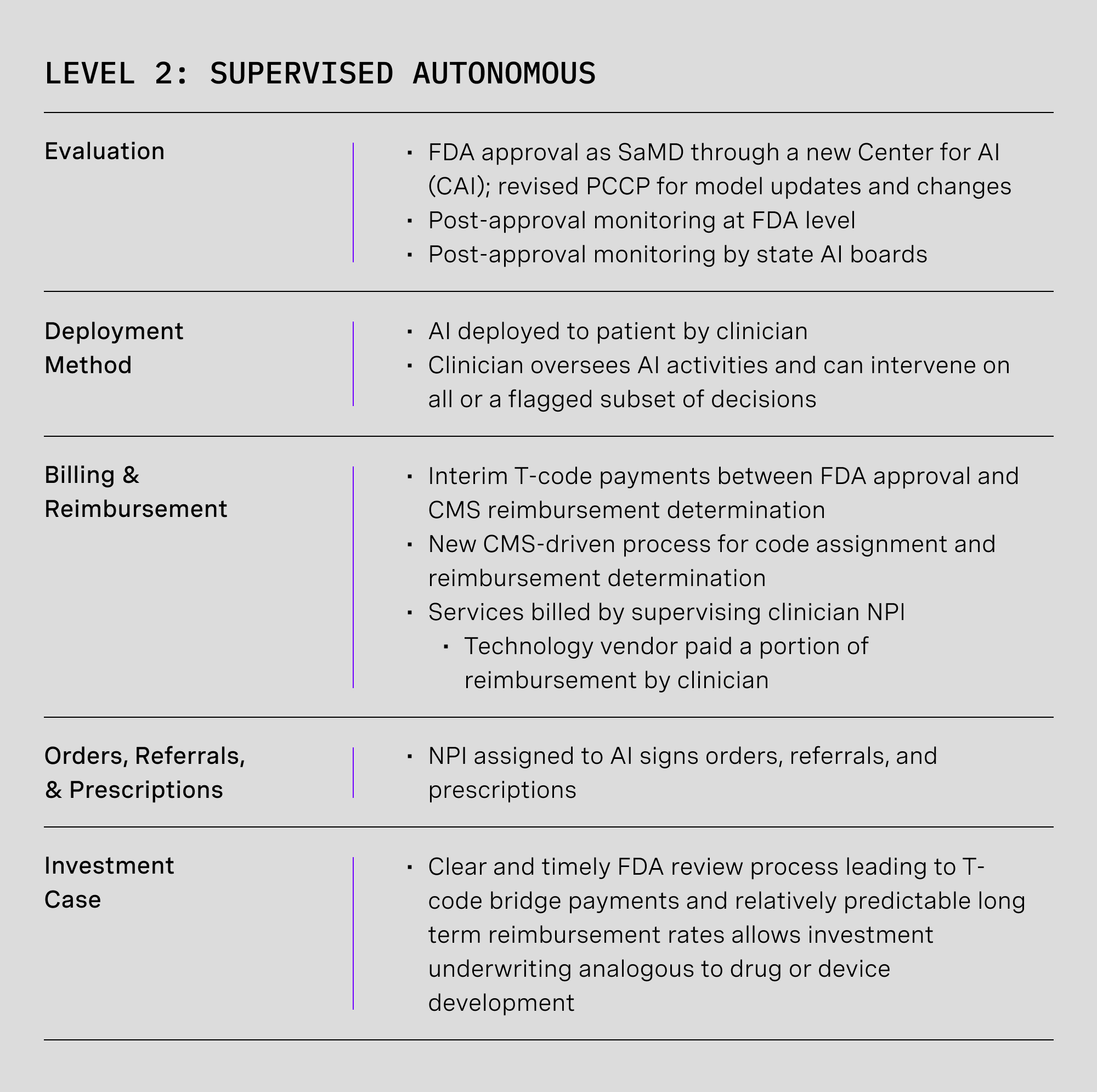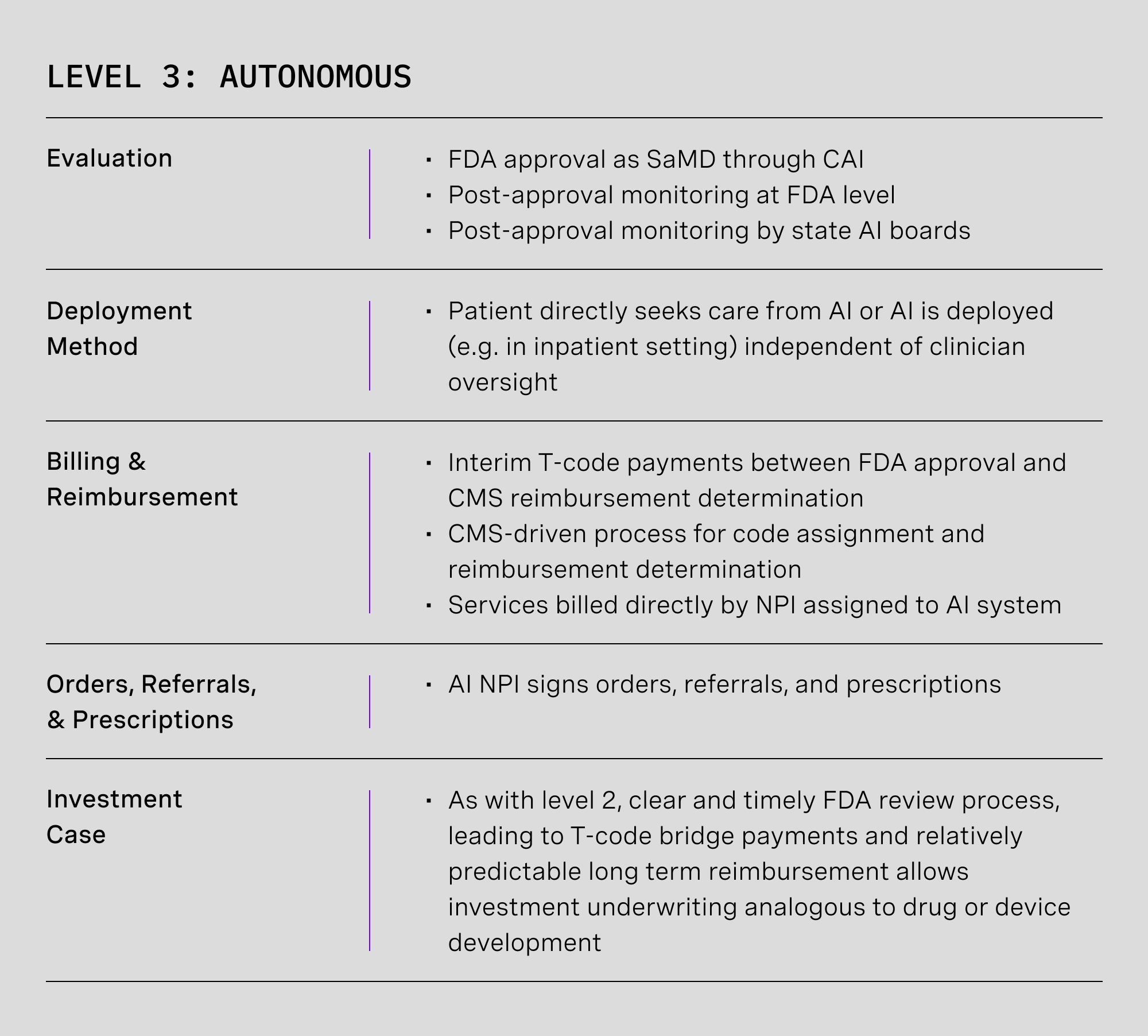 Much like level 1, insurance reimbursement is also a barrier. Technologists will not build it if no reimbursement will come. At this stage, services will be billed under a supervising provider’s National Provider ID (NPI) number but assigning an NPI to the AI system will allow for prescribing and ordering and set the stage for insurance billing at level 3.