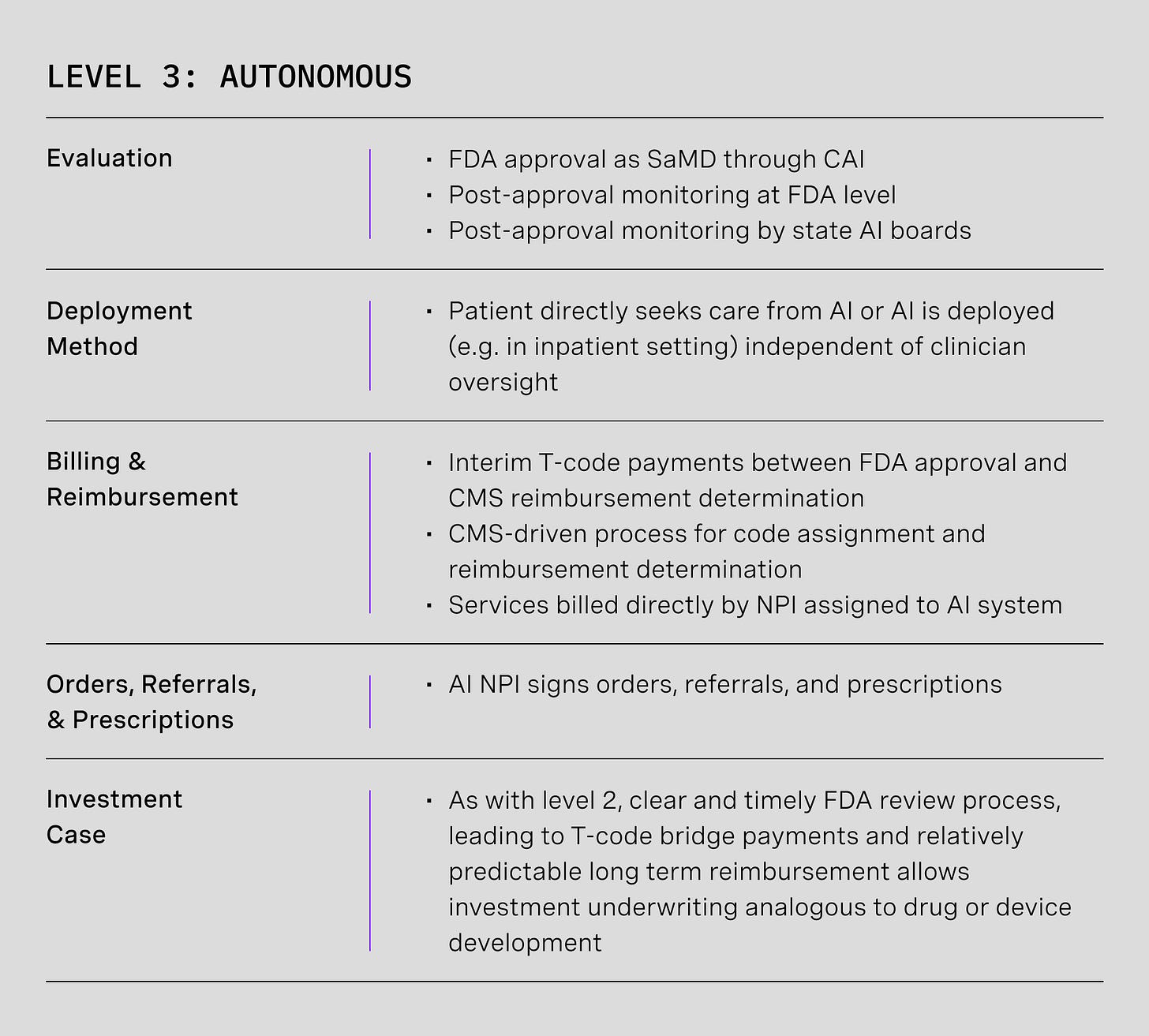 Only a few policy changes are required to open the door to level 3 once level 2 is permissible. The biggest remaining issue is embedded in the Social Security Act, Title XVIII – the very source code for Medicare – namely, defining AI as a type of practitioner that can be eligible for reimbursement.