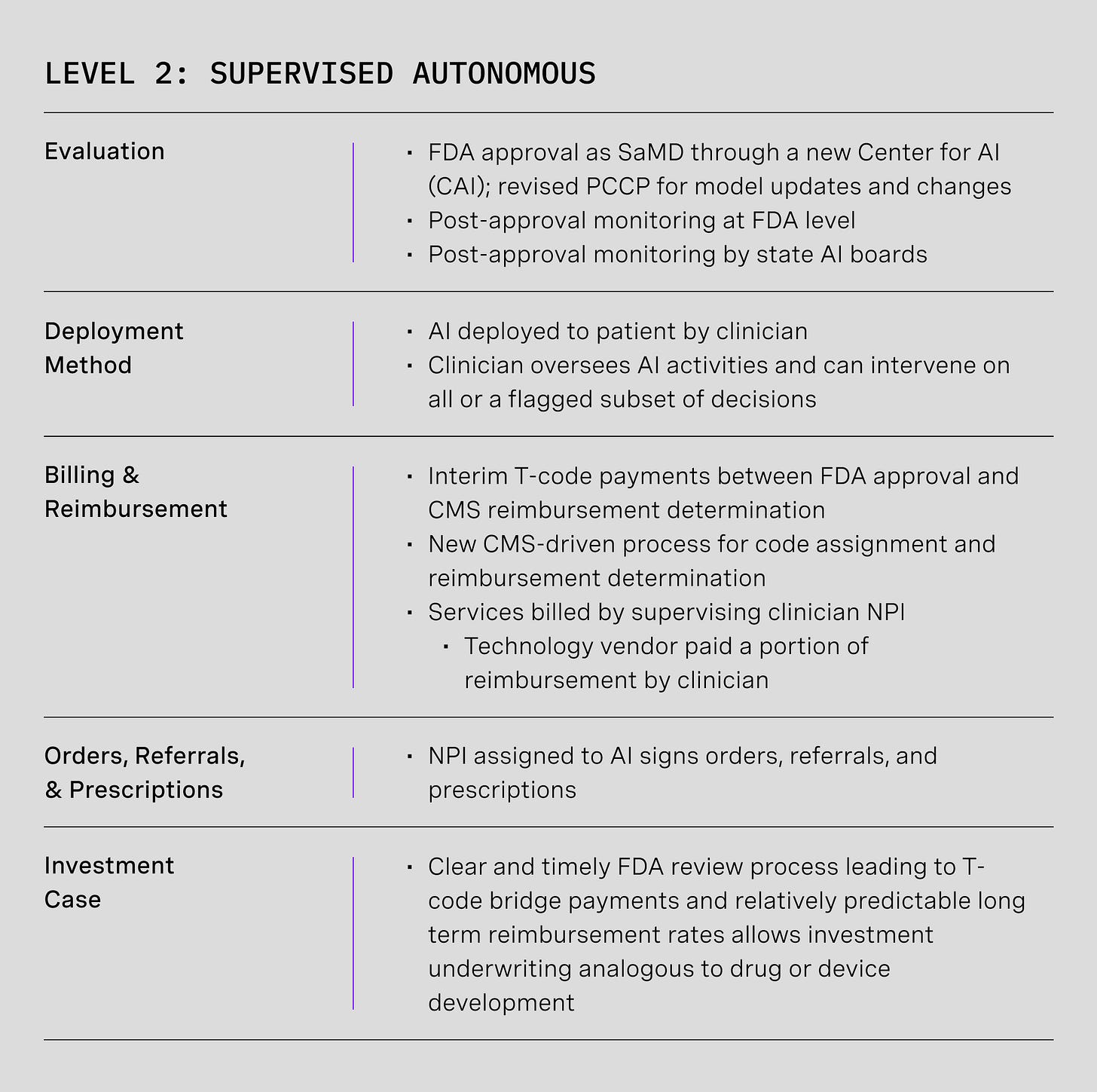 An approach could build upon the pathway described for assistive AI (1.A.) through (an) additional CMMI model(s) defined specifically for supervised autonomy. On pricing, others have written eloquently on autonomous AI reimbursement rates. How the details should work is a question for CMMI analysts and CMS actuaries. We only say that a clear process that results in a code, case rate, or other payment model that is easily billable by a supervising provider NPI and portable to private payers is what can facilitate development of the level 2 ecosystem.
