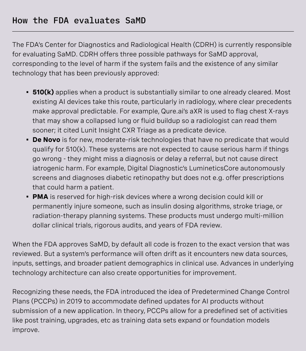 The reason is that healthcare AI is currently banned de facto or de jure in the United States. By and large, healthcare AI can’t receive payments from insurance which makes it a losing economic prospect. Even if payments existed, all fifty states have medical practice acts that would likely prohibit AI from prescribing or diagnosing: offending H100s would be ripped out of us-east-1 and locked up in Manassas Regional Adult Detention Center for the illegal practice of medicine. At the federal level the Social Security Act puts further limitations on any healthcare practitioner not licensed by individual states. And so on: the restrictions are manyfold and located across a web of federal regulations, state law, and federal statute.