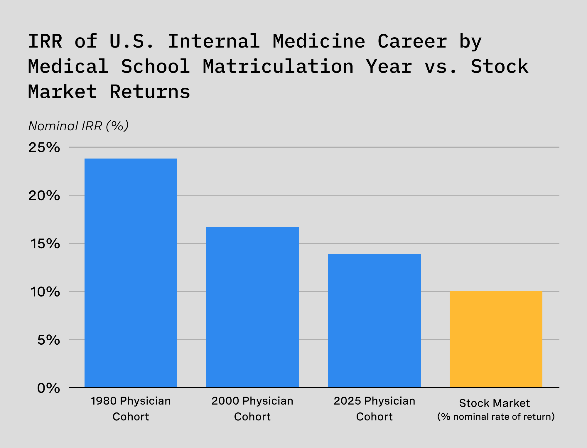 When only 37% of American physicians would recommend their own profession to their children, it is fair to say that something is rotten in the state of medicine. Is it prestige or pay? The former is in the eye of the beholder, but the latter can be assessed empirically. We know doctors are taking on perhaps $250,000 in debt to begin earning a salary in their thirties, but just how bad is it out there? If we think about medical education as investment and salaries as returns, some quick math suggests internal medicine is not much better than putting money in the stock market instead. Sadly, the stock market gets closer to winning every year.