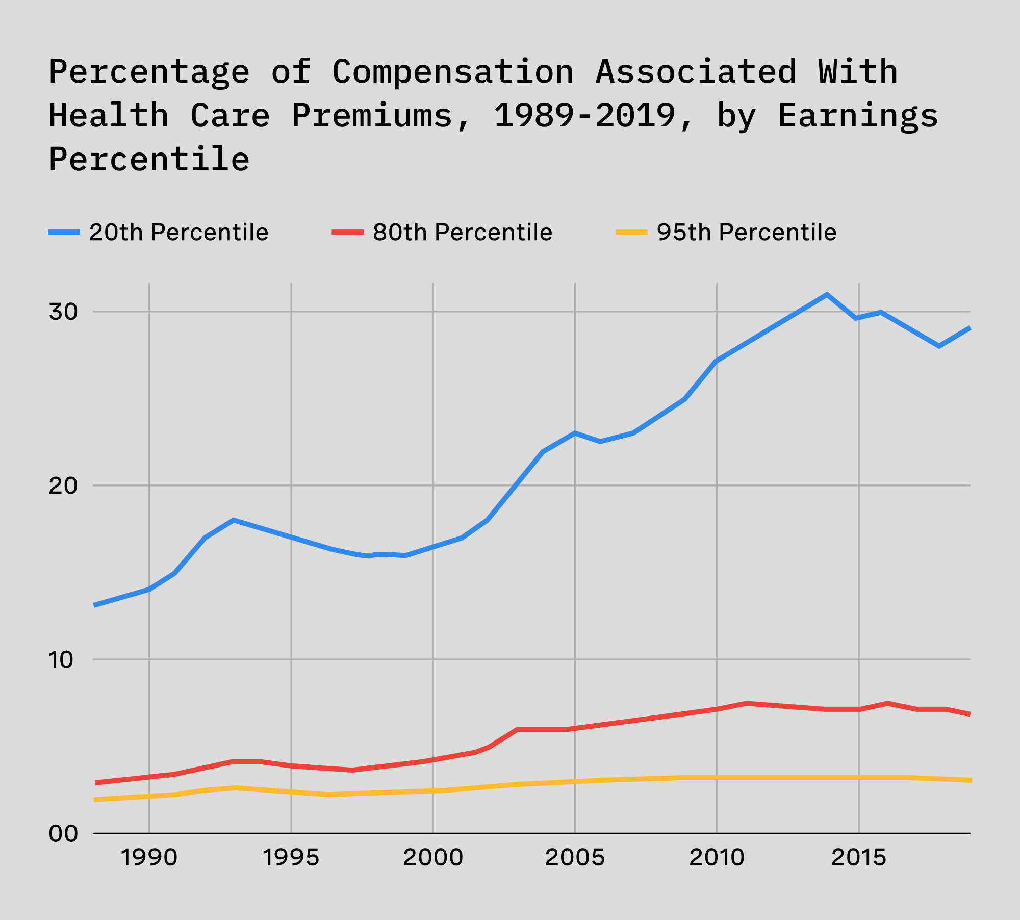 Consider that every employee at a firm earns a different wage, but that health insurance premiums are the same if you make $40,000 or $400,000. Consider also that at 7% growth, 2026 is a bad but not particularly anomalous yearfor insurance prices. Over time health insurance has become a bigger and bigger component of working class Americans’ pay; what was once 12% is now closer to 30% of total compensation.