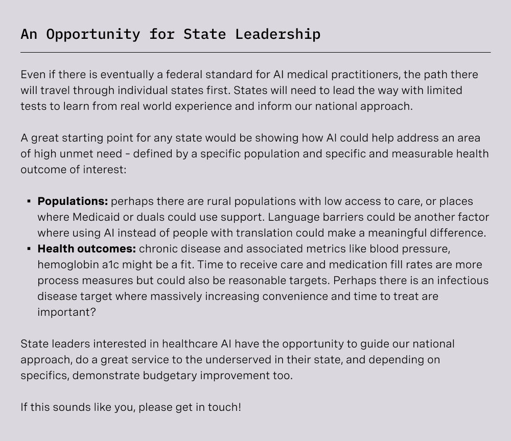 The cleanest path forward would be for states to pass Medical AI Practice Acts that award a new class of medical licensure to FDA-approved healthcare AI. Approved SaMD could have a scope of practice aligned with its FDA label. An associated state Medical AI Board defined by the Practice Act can expand or contract scope as the label evolves, work with the FDA to monitor performance (in line with item 2.A.3.), and sanction AI companies that do not respond appropriately to inquiries and warning flags related to failure or degradation. States will ideally adopt uniform language for formation of Medical AI Boards to reduce the complexity of market entry for new models and create the strongest possible environment for spurring investment.
