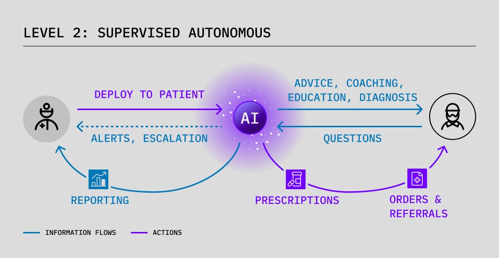 Level 2 builds on level 1 by adding the ability to legally practice medicine: diagnosing, prescribing, and referring just like a doctor. Actually, more like a nurse practitioner or physician assistant: level 2 systems would be deployed to patients and overseen by a supervising clinician. All AI activities would be auditable and all or a flagged subset of medical decisions (e.g. unusual prescription changes, a decision flagged by AI for uncertainty, or anything flagged at the patient’s own request) could be subject to supervisor review before actioning.