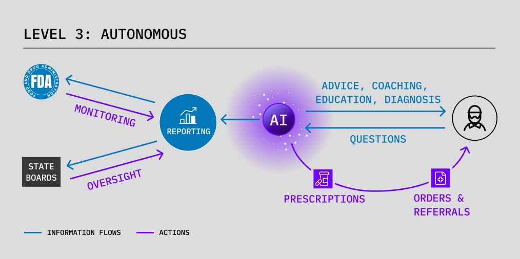 Levels 1, 2, and 3 are the steps forward that can transform patient experience, costs, and ultimately health outcomes; these are also the types of healthcare AI that are variously banned today. It is important that each level is not only legally permissible but also investable to build and proliferate new AI systems.